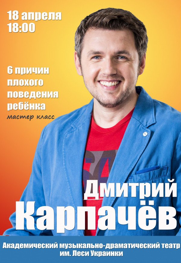 Дмитрий Карпачев "6 причин плохого поведения ребенка" состоится 18 апреля 2017, 18:00, вторник в Академический музыкально-драматический театр им. Леси Украинки (Основная сцена, пл. 250-летия города, 2). С помощью сервиса internet-bilet.ua, Вы сможете с легкостью забронировать, заказать и купить билеты на интересующий Вас концерт, спектакль, оперу, балет, мастер-классы, спортивные и детские мероприятия, оплатив их самым удобным для Вас способом: через интернет банковской картой VISA/MasterCard, наличными или курьером, если сделаете заказ билета c доставкой.