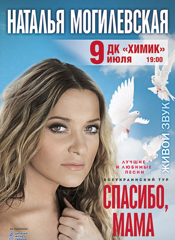 Наталья Могилевская состоится 9 июля 2014, 19:00, среда в Дворец культуры «Химик». С помощью сервиса internet-bilet.ua, Вы сможете с легкостью забронировать, заказать и купить билеты на интересующий Вас концерт, спектакль, оперу, балет, мастер-классы, спортивные и детские мероприятия, оплатив их самым удобным для Вас способом: через интернет банковской картой VISA/MasterCard, наличными или курьером, если сделаете заказ билета c доставкой.