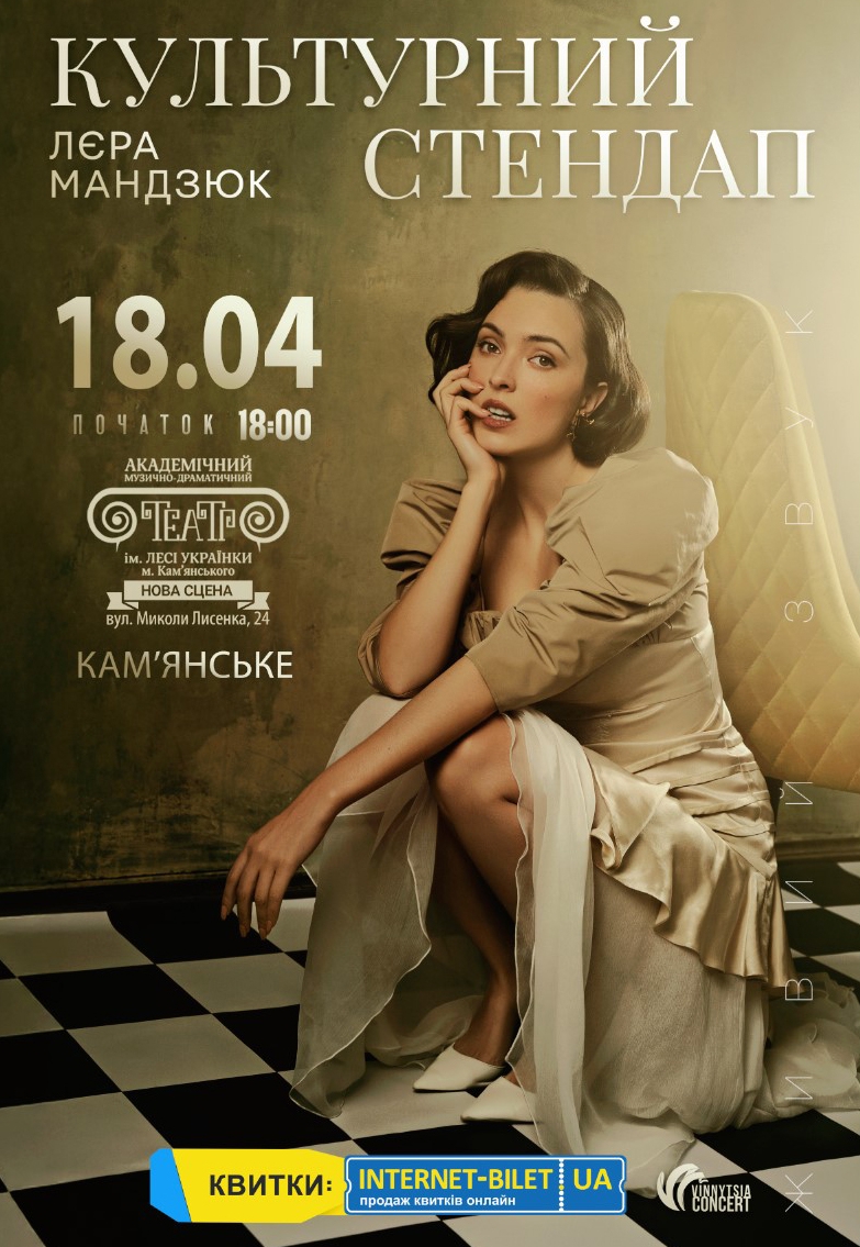 Лера Мандзюк состоится 18 апреля 2026, 18:00, суббота в Академический музыкально-драматический театр им. Леси Украинки (Новая сцена, ул. Н. Лысенко, 24). С помощью сервиса internet-bilet.ua, Вы сможете с легкостью забронировать, заказать и купить билеты на интересующий Вас концерт, спектакль, оперу, балет, мастер-классы, спортивные и детские мероприятия, оплатив их самым удобным для Вас способом: через интернет банковской картой VISA/MasterCard, наличными или курьером, если сделаете заказ билета c доставкой.
