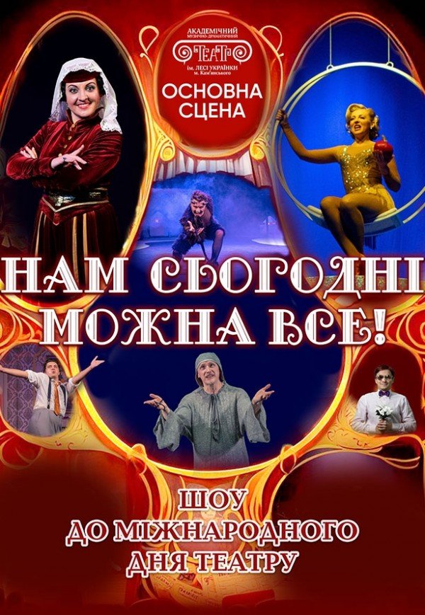 Шоу до Дня театру «Нам сьогодні можна все!» відбудеться 27 березня 2026, 18:00, п’ятниця в Академічний музично-драматичний театр ім. Лесі Українки (Основна сцена, пл. 250-річчя міста, 2). За допомогою сервісу internet-bilet.ua, Ви зможете з легкістю забронювати, замовити та купити квитки на концерт, спектакль, оперу, балет, майстер-класи, спортивні та дитячі заходи, що Вас цікавлять, оплативши їх найбільш зручним для Вас способом: через інтернет банківською карткою VISA/MasterCard, готівкою або кур'єром, якщо зробите замовлення квитка з доставкою.